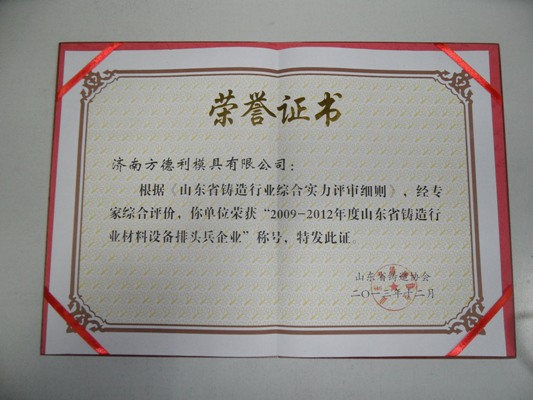 我公司被评为《山东省铸造行业材料设备排头兵企业》荣誉称号